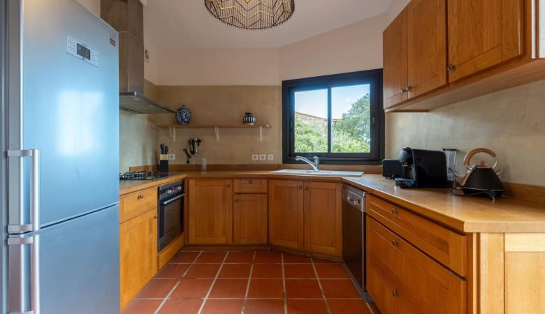 Zugang über einige Stufen zur ausgestatteten Küche mit Esszimmer und Wohnzimmer mit Zugang zur Terrasse.