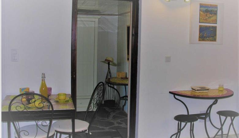 Ein Schlafzimmer: 1 Bett 140 x 190, offen zur Terrasse-Patio.