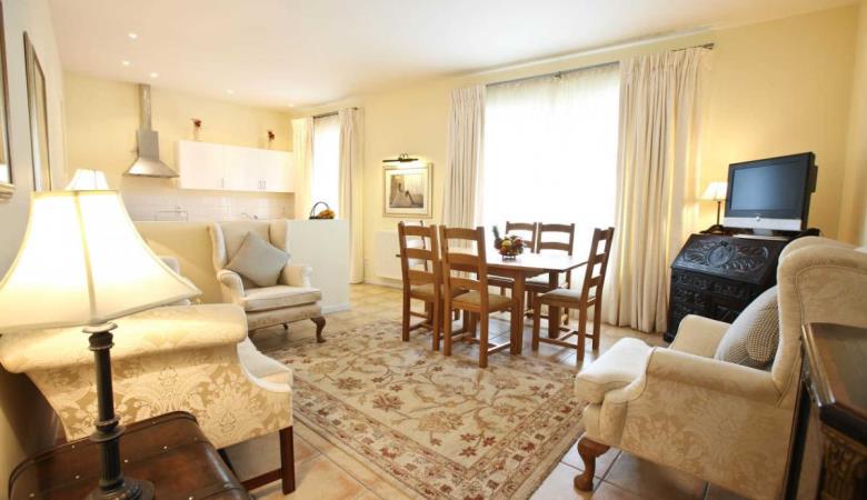 Großes Wohnzimmer mit ausgestatteter Küchenzeile.