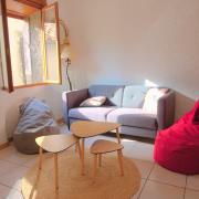 Wohnung im Erdgeschoss: 1 Wohnzimmer, 1 Küche, 2 Schlafzimmer, 2 Doppelbetten, 1 Sitzbank, 2 WC, Elektroheizung, Gartenhaus, Pergola, Hof mit Tor geschlossen (ca. 100 m2)