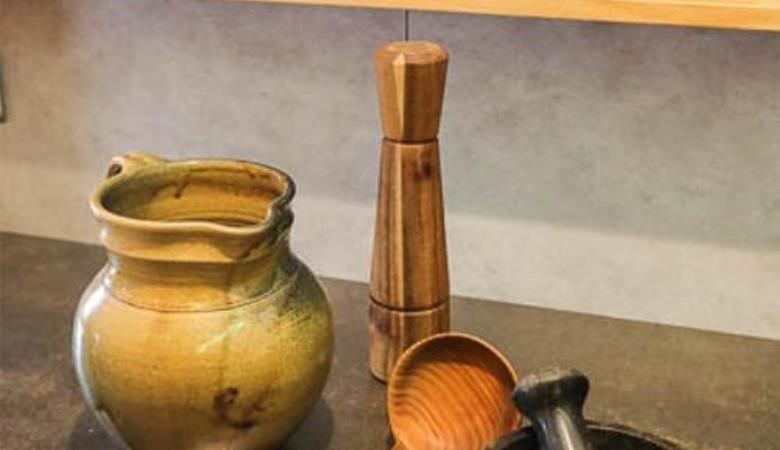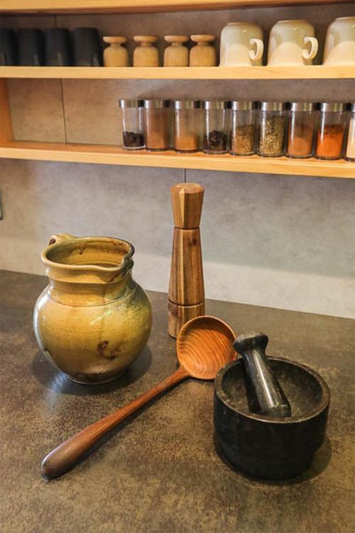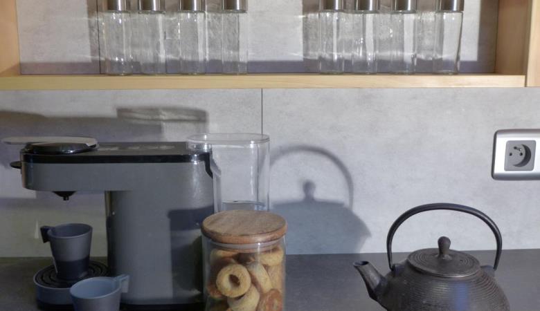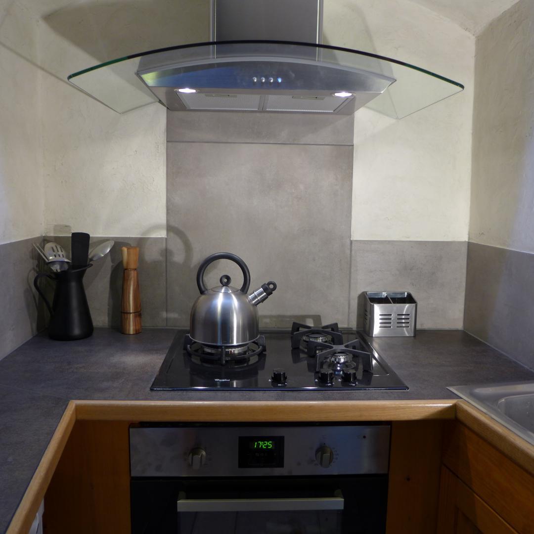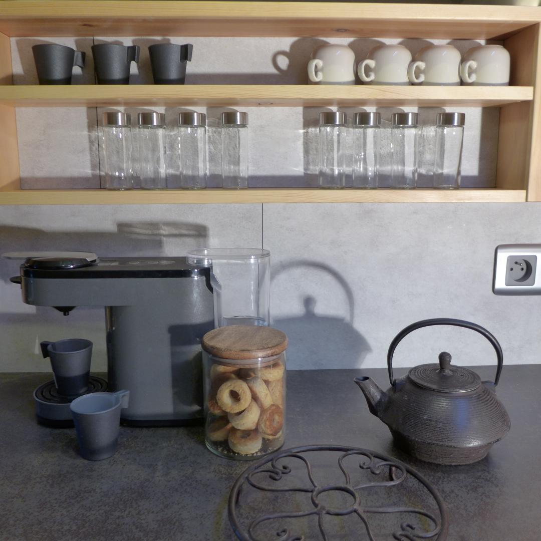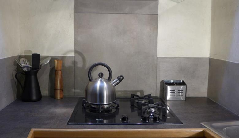 - Küchenecke mit Zugang zu einem überdachten Balkon.