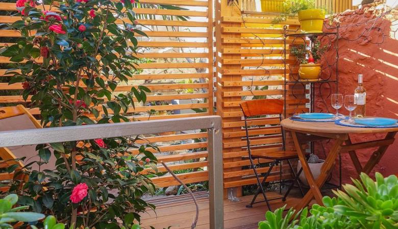 La Grange aux hirondelles profitiert von einem eigenen Eingang in einer ruhigen Seitenstraße und besteht im Erdgeschoss aus einem ca. 16 m² großen Hauptraum mit voll ausgestatteter Küche, Essbereich, Wohnzimmer und WC; im Obergeschoss befindet sich im Zwischengeschoss ein Schlafzimmer mit einem Doppelbett und ein angrenzendes Badezimmer mit begehbarer Dusche und Waschbecken. Der Raum im Erdgeschoss bietet Zugang zu einer privaten Terrasse von ca. 12 m² mit Gartenmöbeln und Liegestühlen.