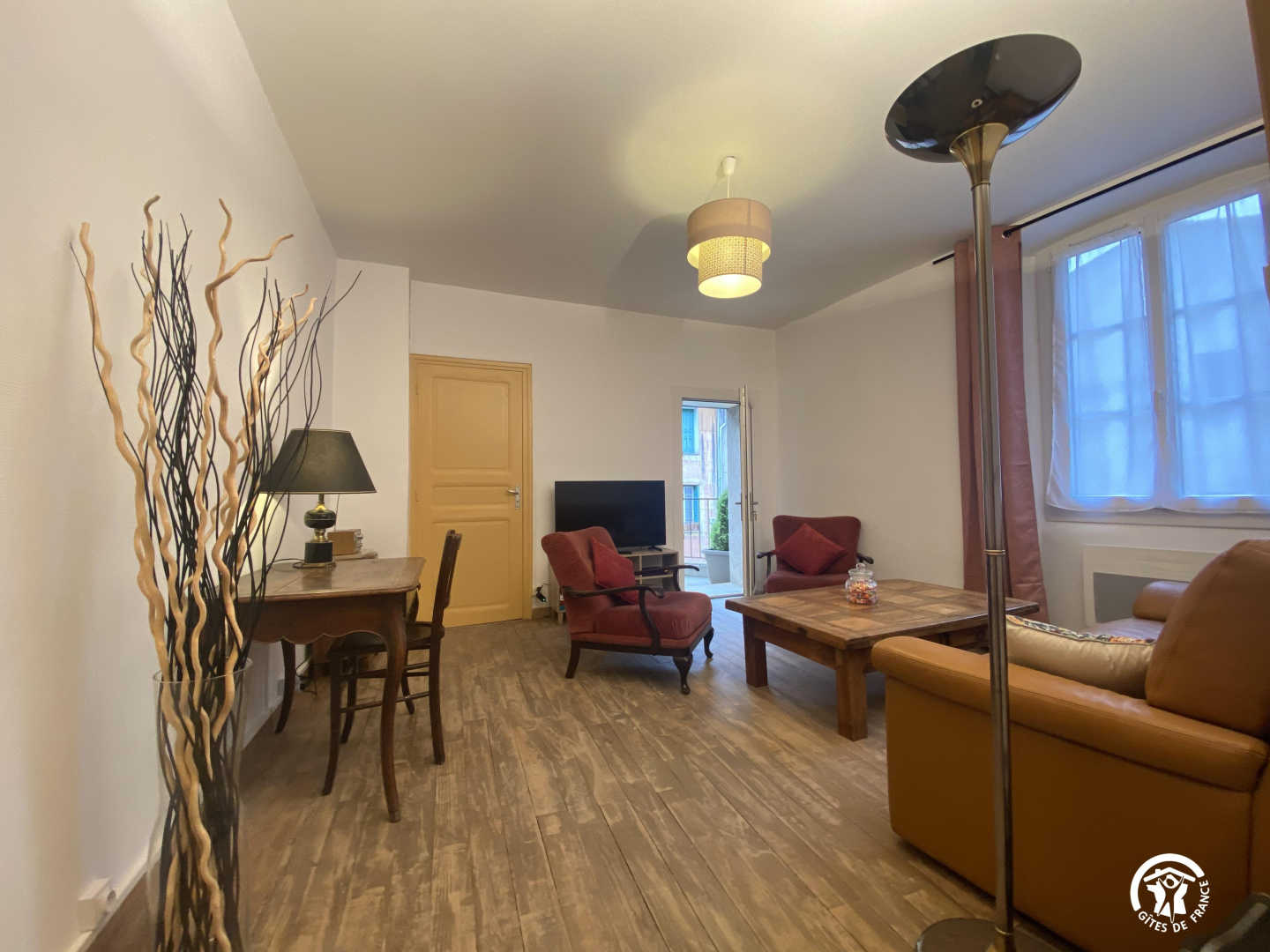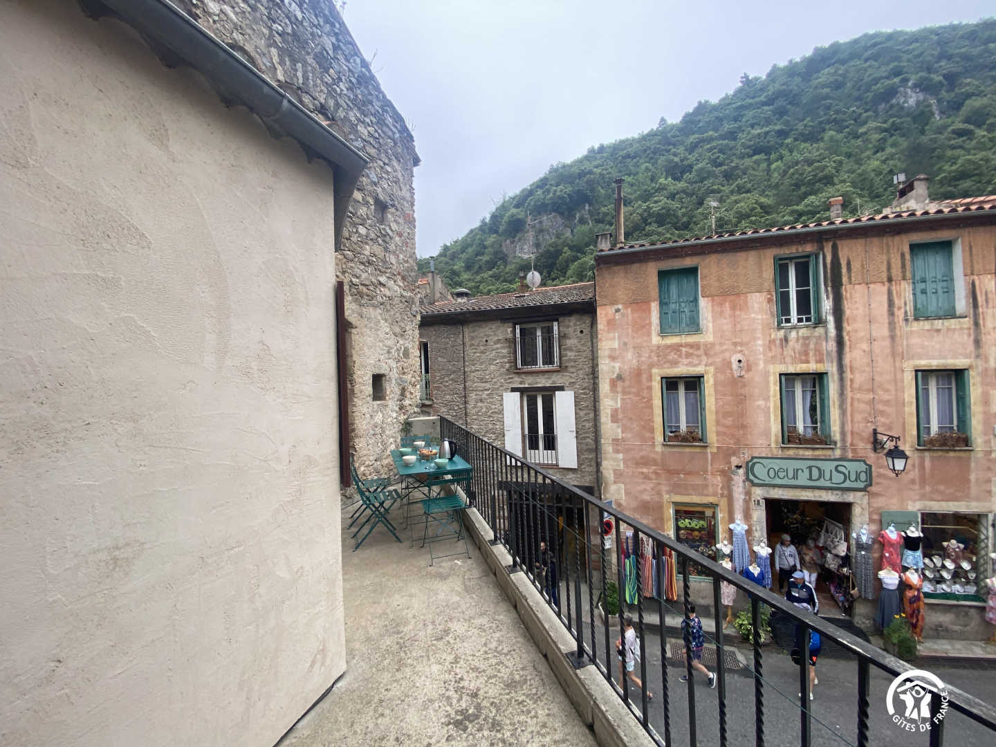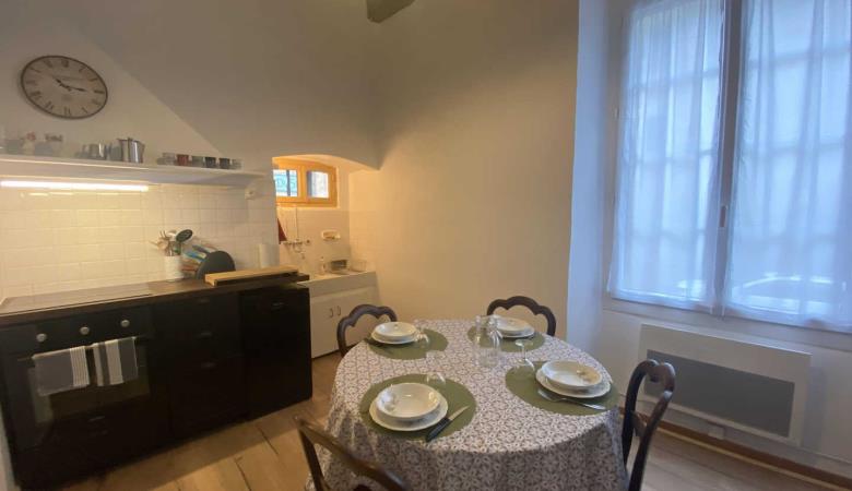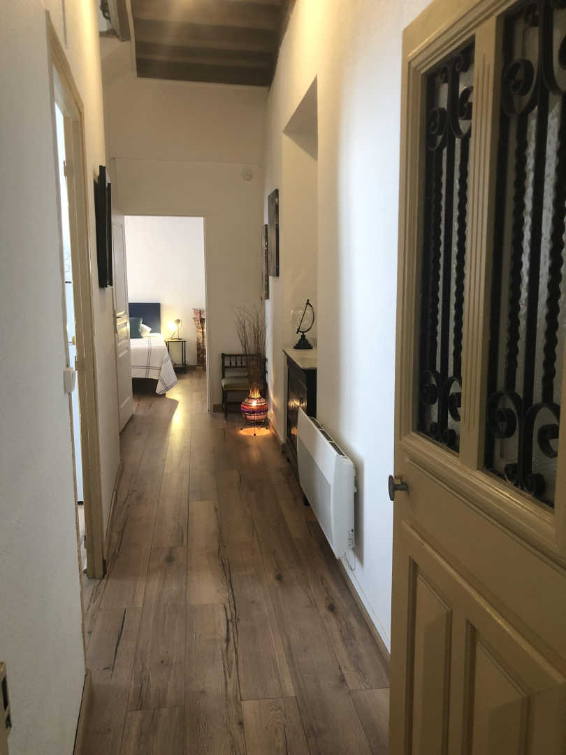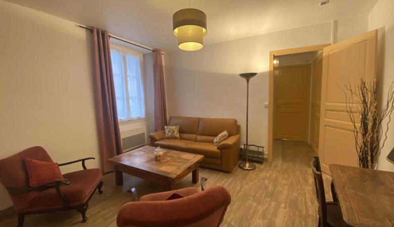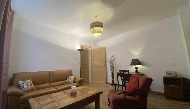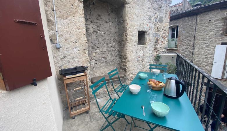 Wohnzimmer mit Zugang zur 14 m² großen privaten Terrasse mit Gartenmöbeln und Plancha, mit erhöhtem Blick auf die Gassen, aber bei schönem Wetter auch auf das Fort Liberia.