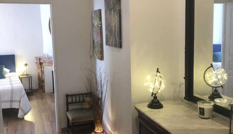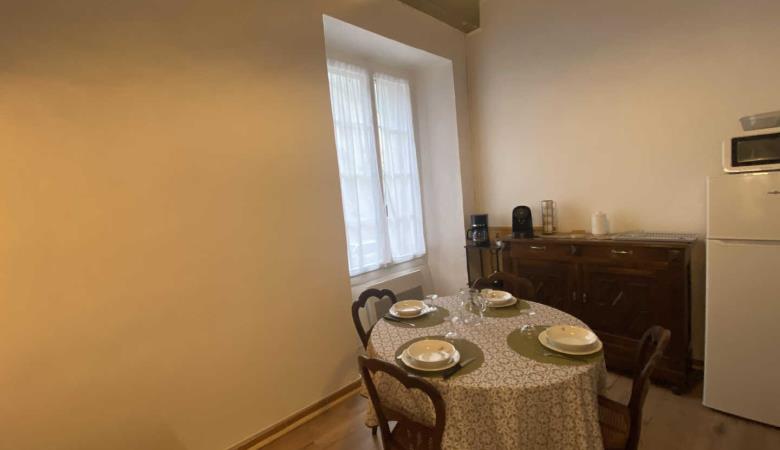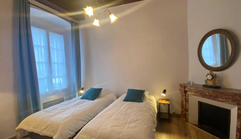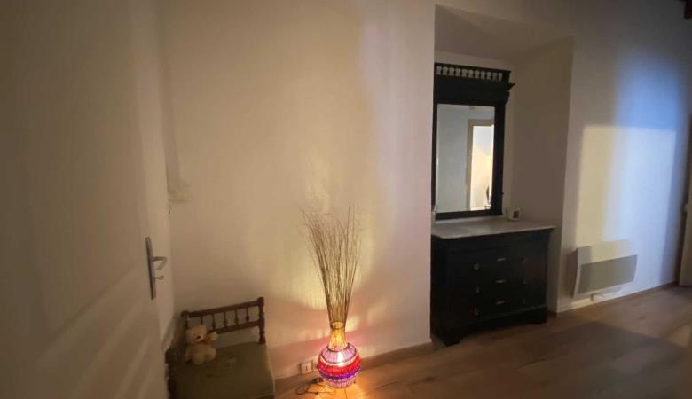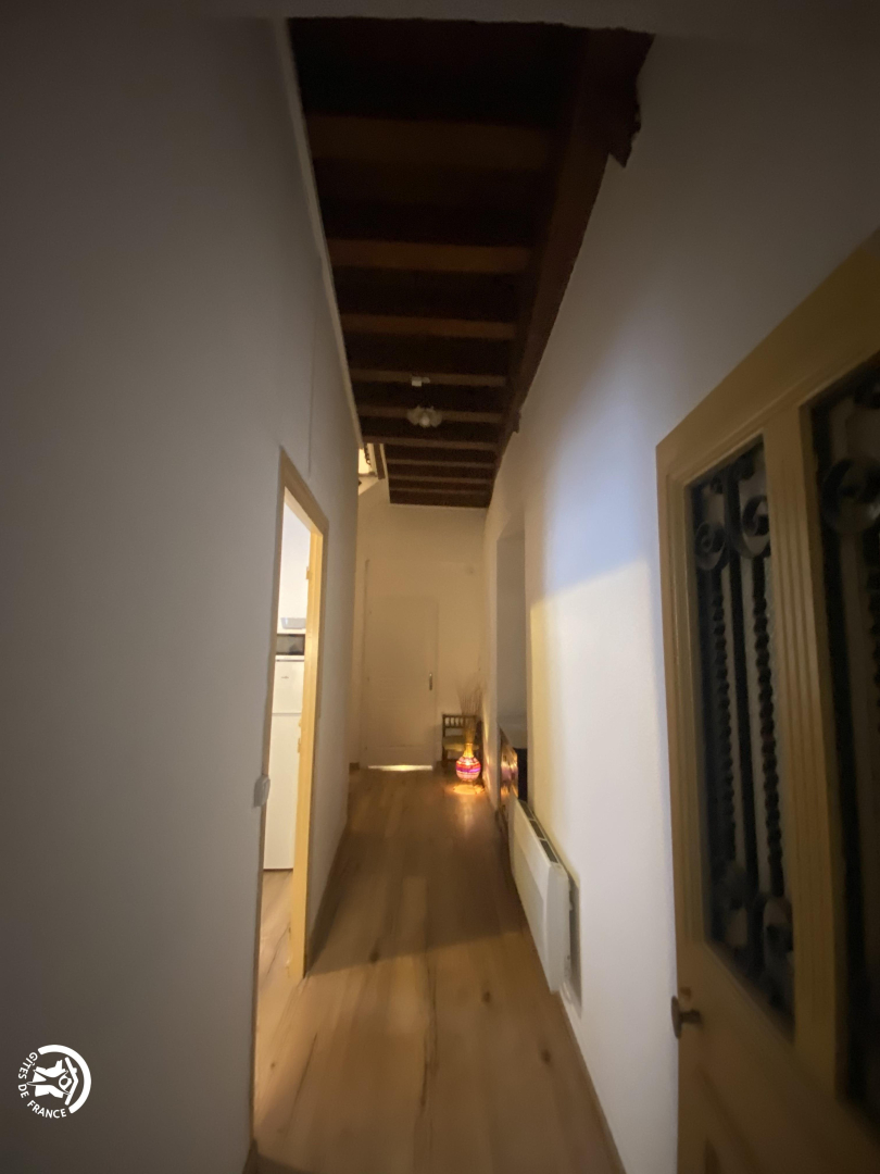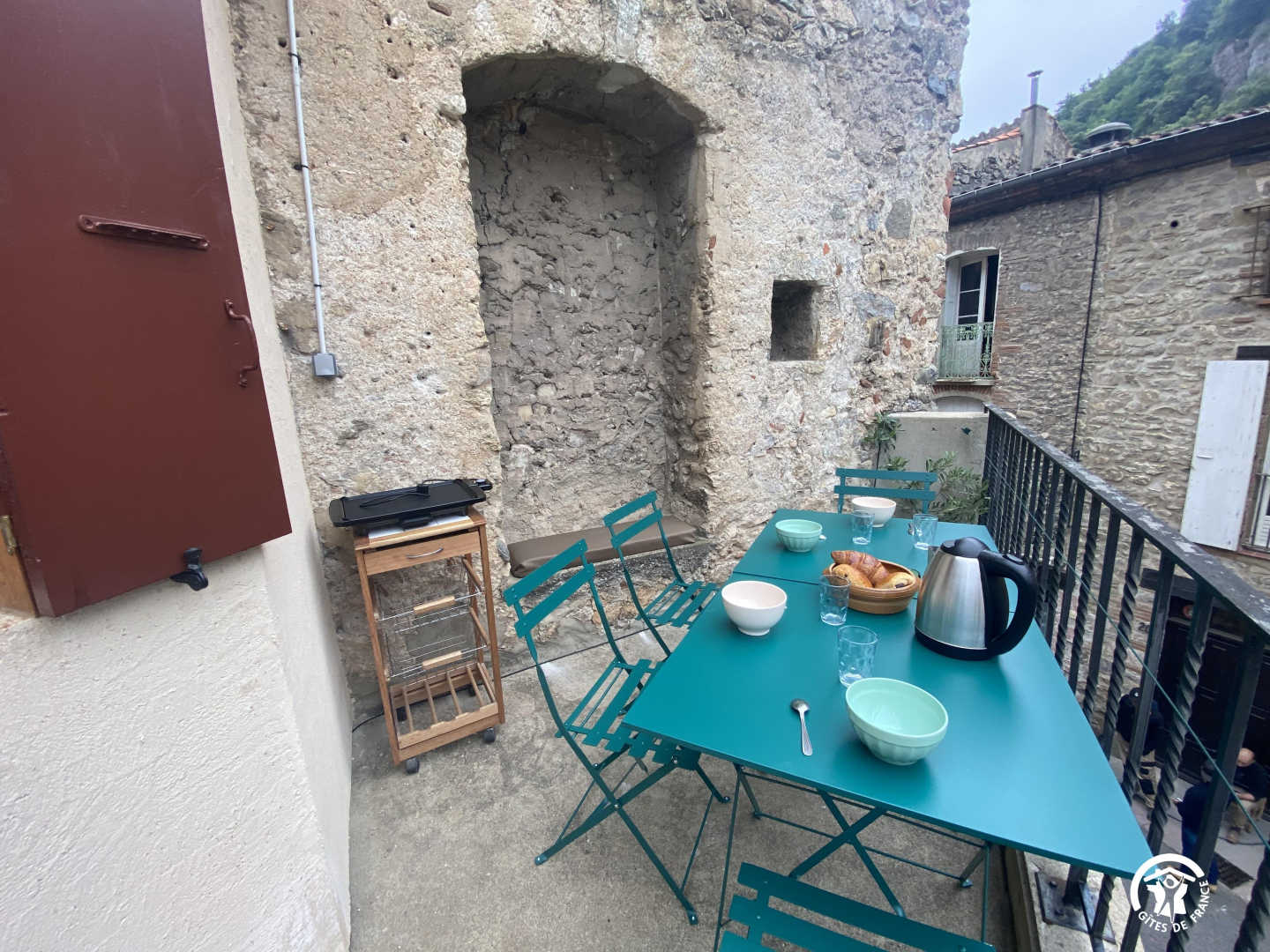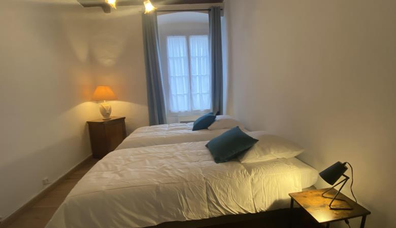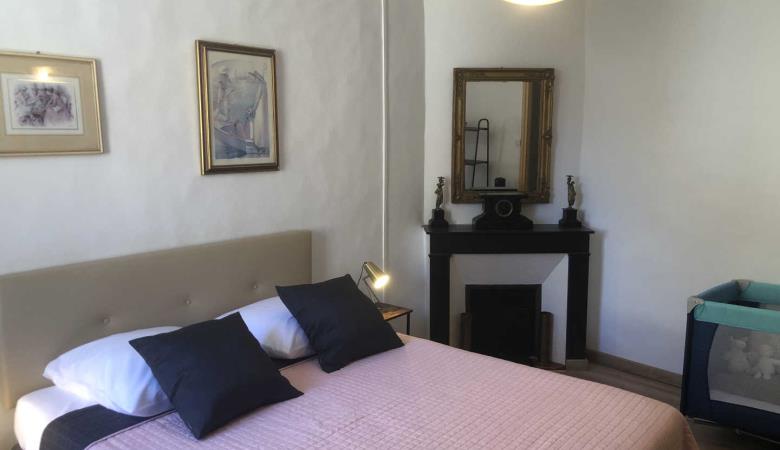 Wohnzimmer mit Zugang zur 14 m² großen privaten Terrasse mit Gartenmöbeln und Plancha, mit erhöhtem Blick auf die Gassen, aber bei schönem Wetter auch auf das Fort Liberia.