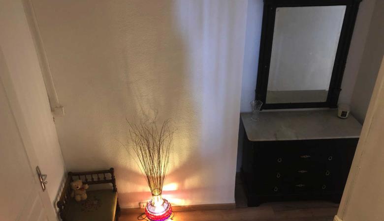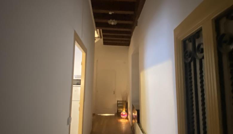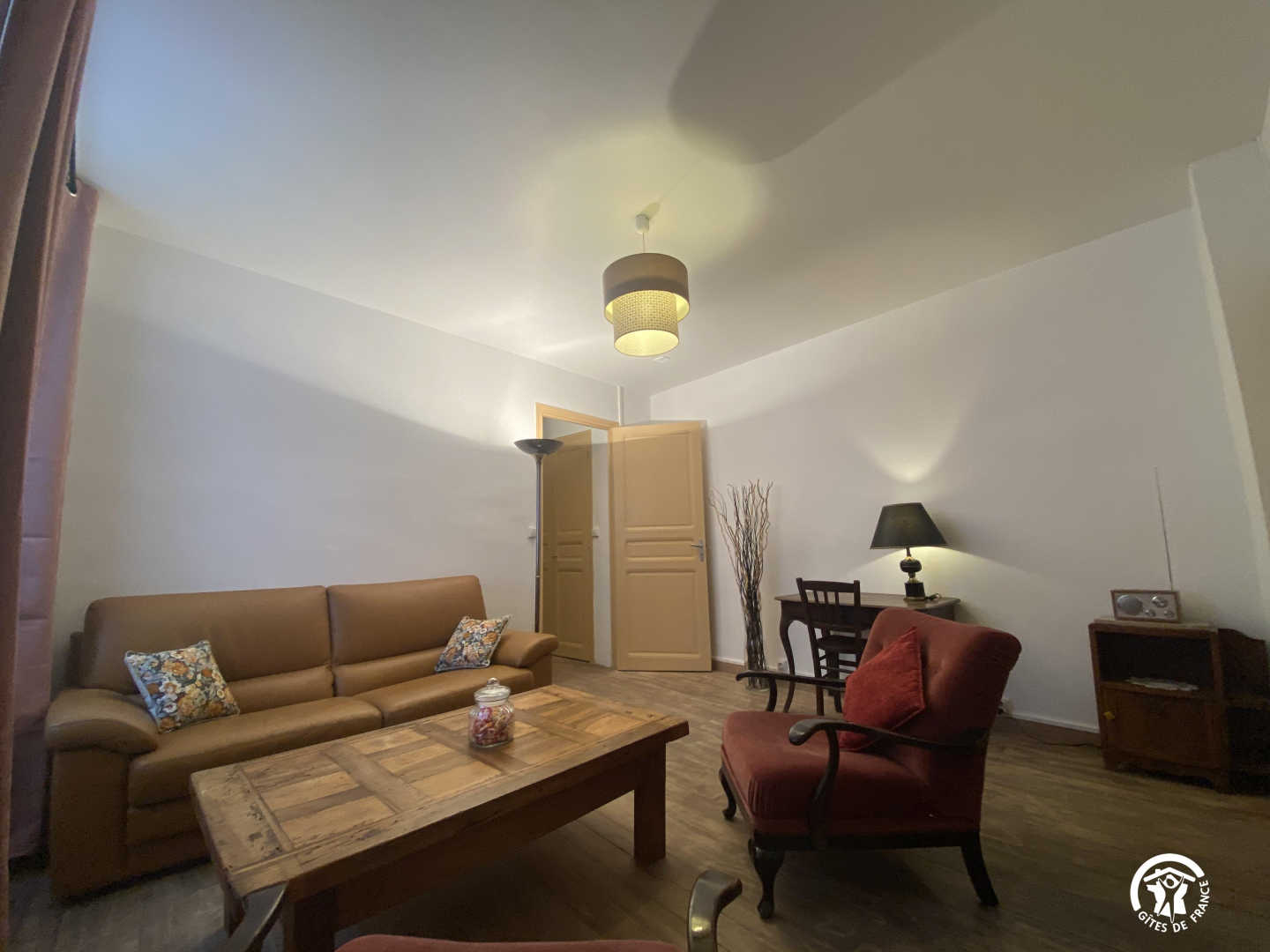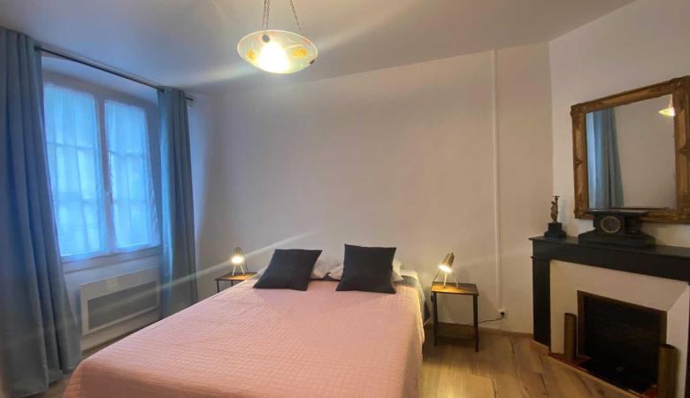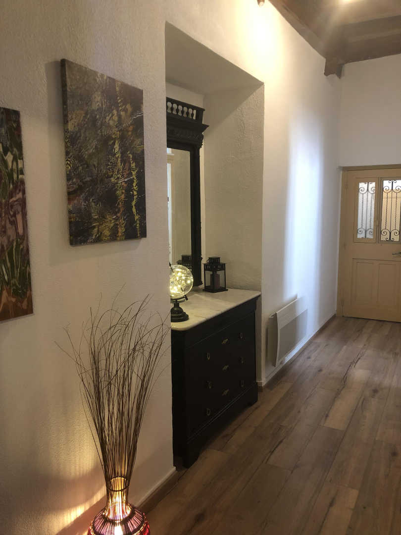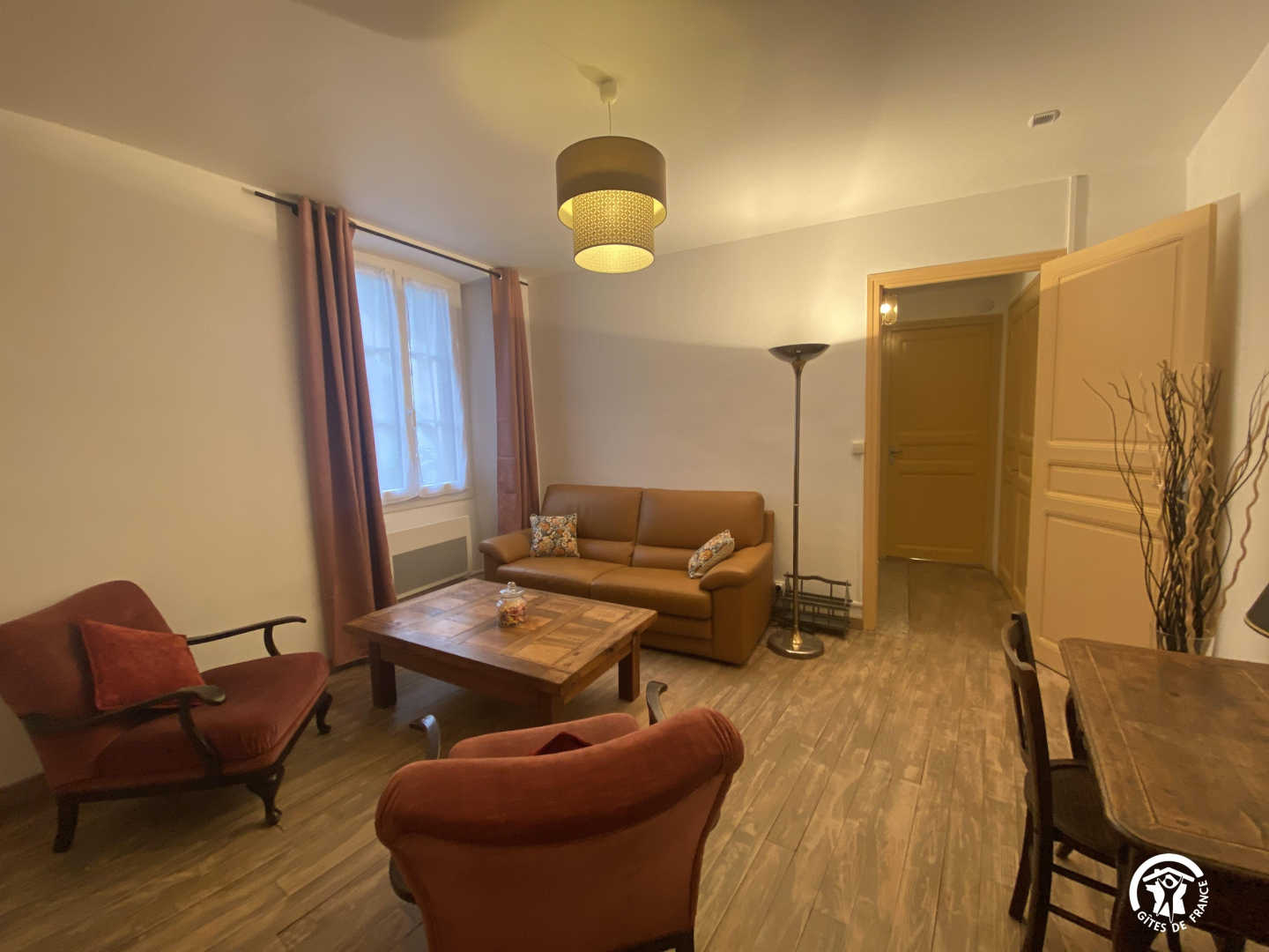 Wohnzimmer mit Zugang zur 14 m² großen privaten Terrasse mit Gartenmöbeln und Plancha, mit erhöhtem Blick auf die Gassen, aber bei schönem Wetter auch auf das Fort Liberia.
