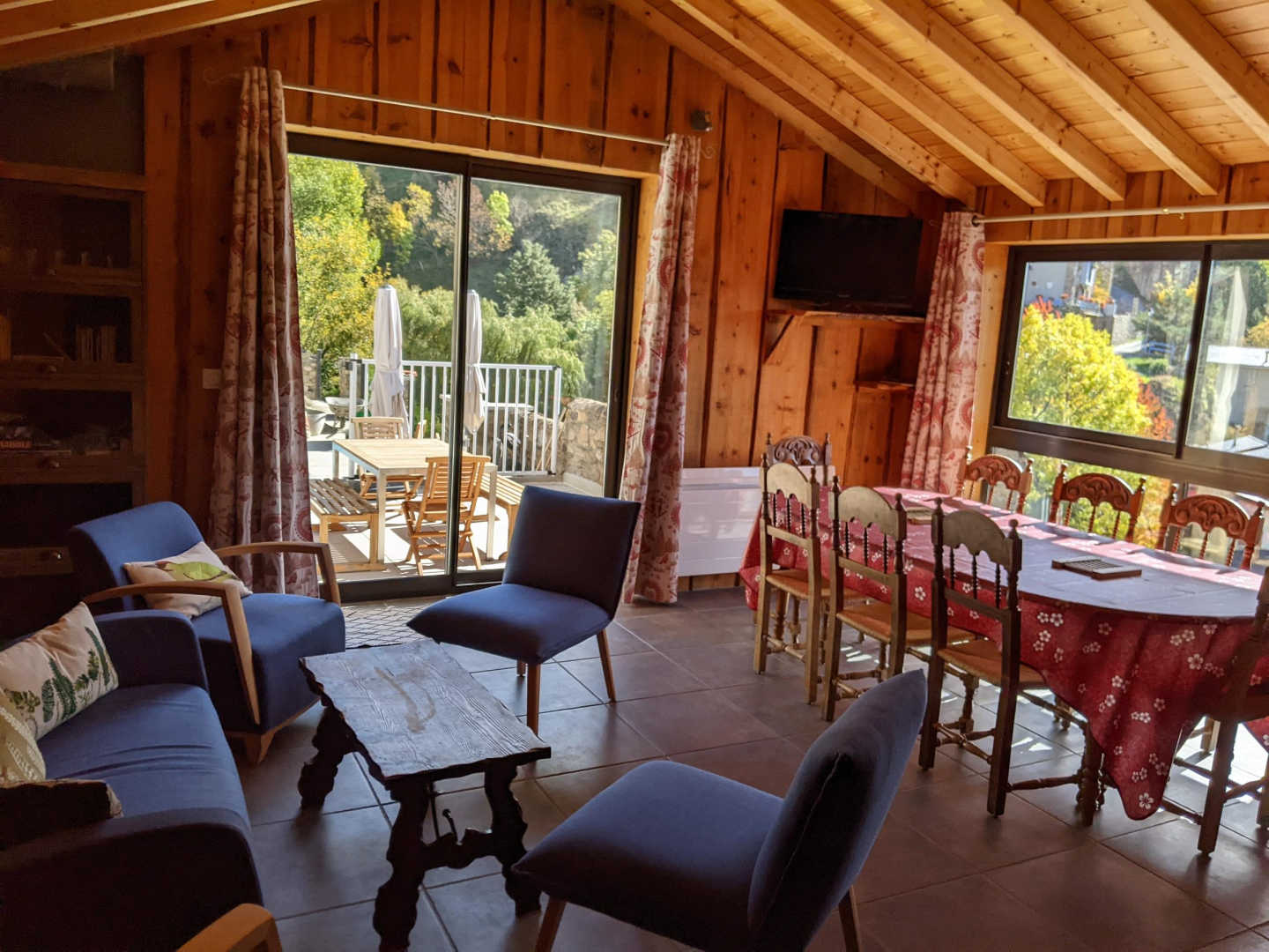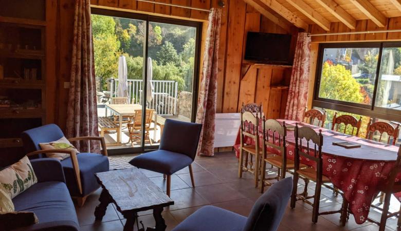 Ein großer Wohnraum mit Küche, Esszimmer und Wohnzimmer öffnet sich auf die private Terrasse.