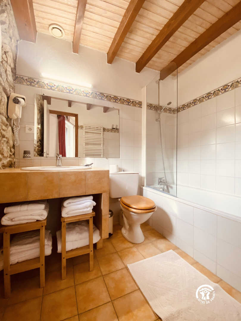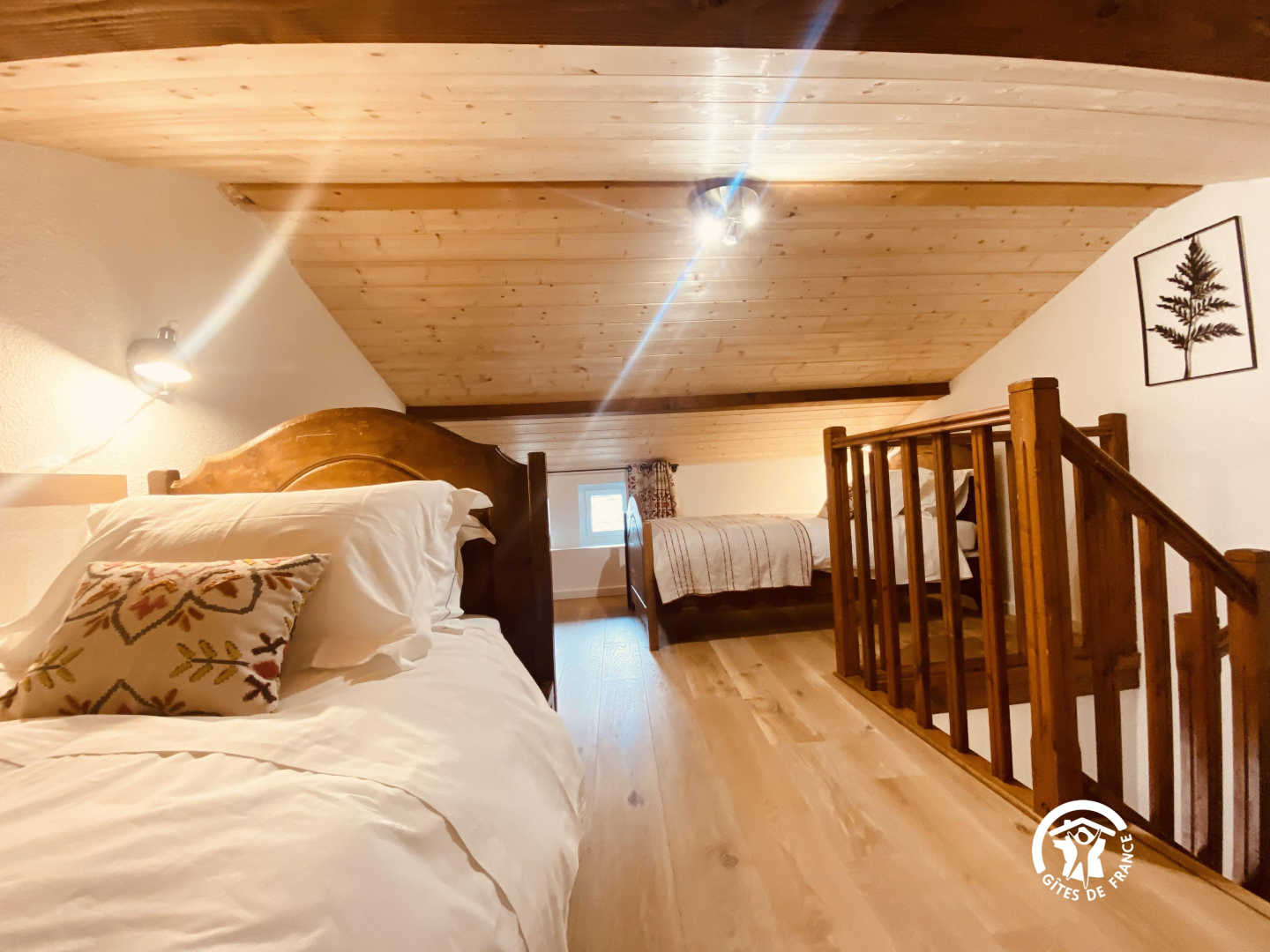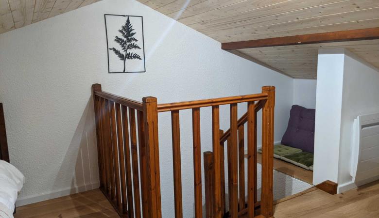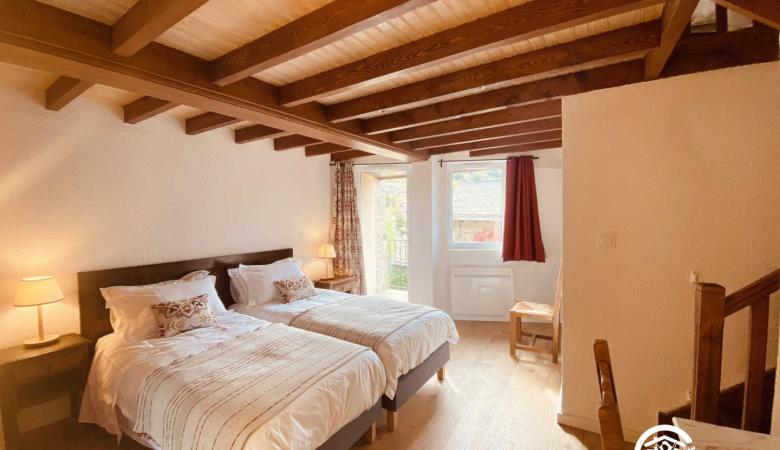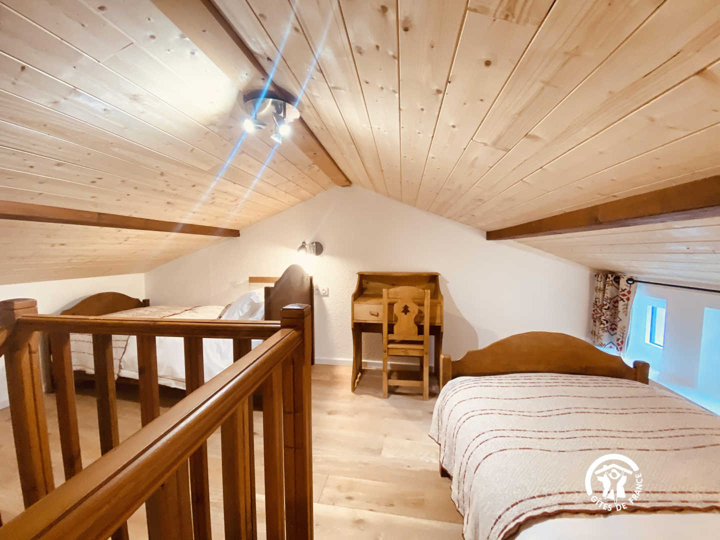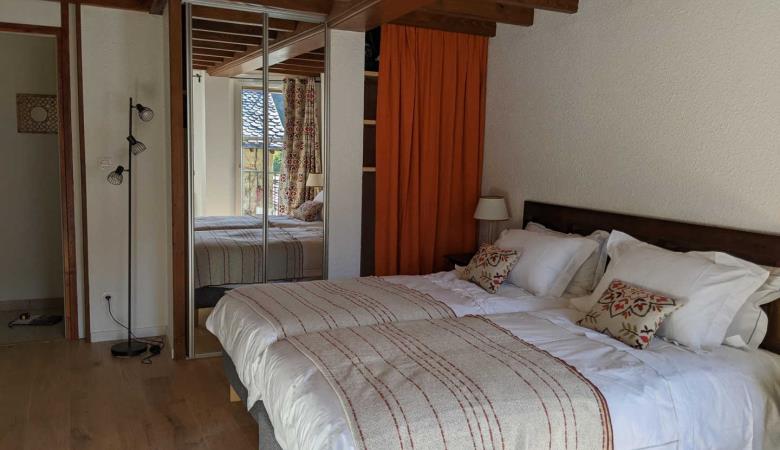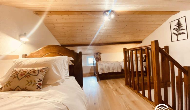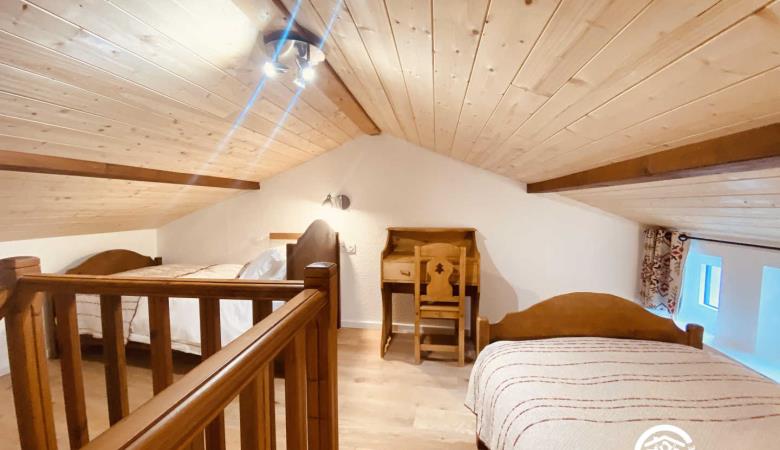 eine Mezzanine mit 2 Einzelbetten 90 und angrenzendem Badezimmer mit kleiner Badewanne und WC. 1 separates WC.