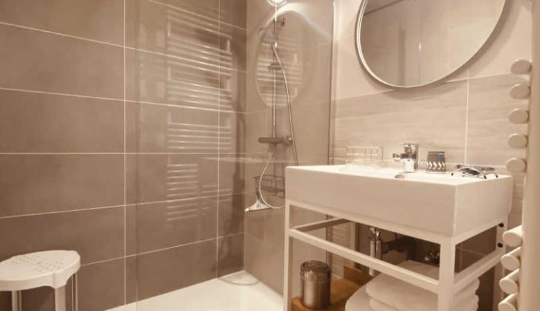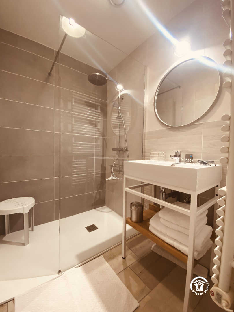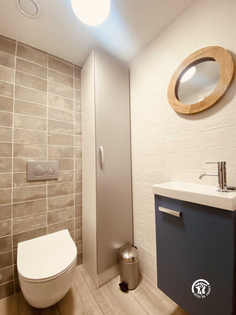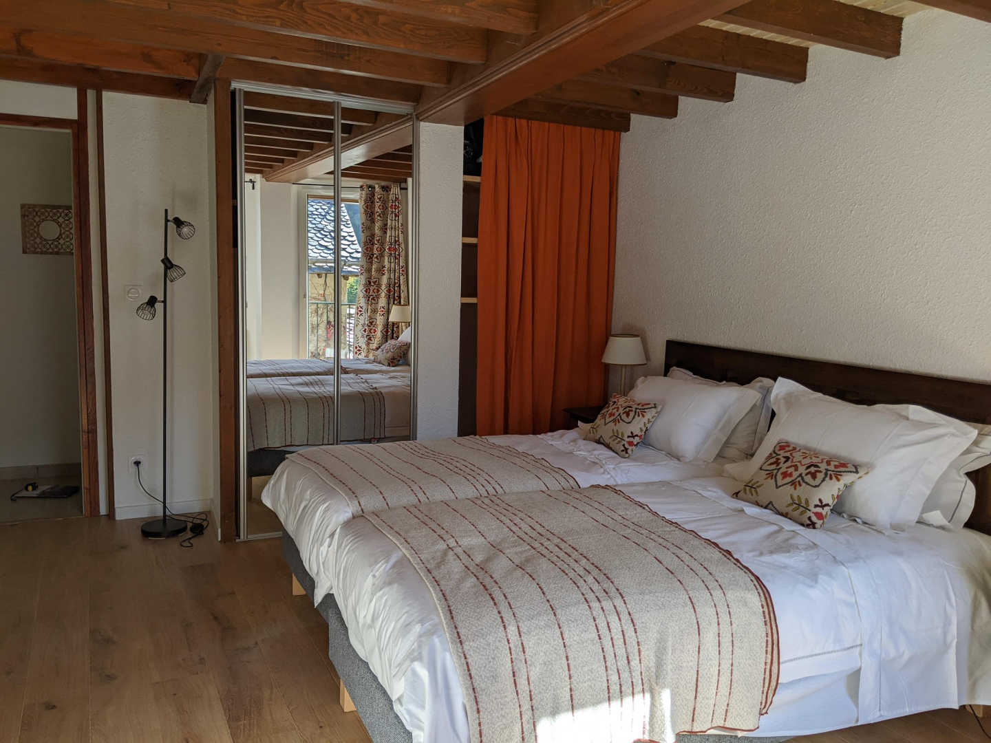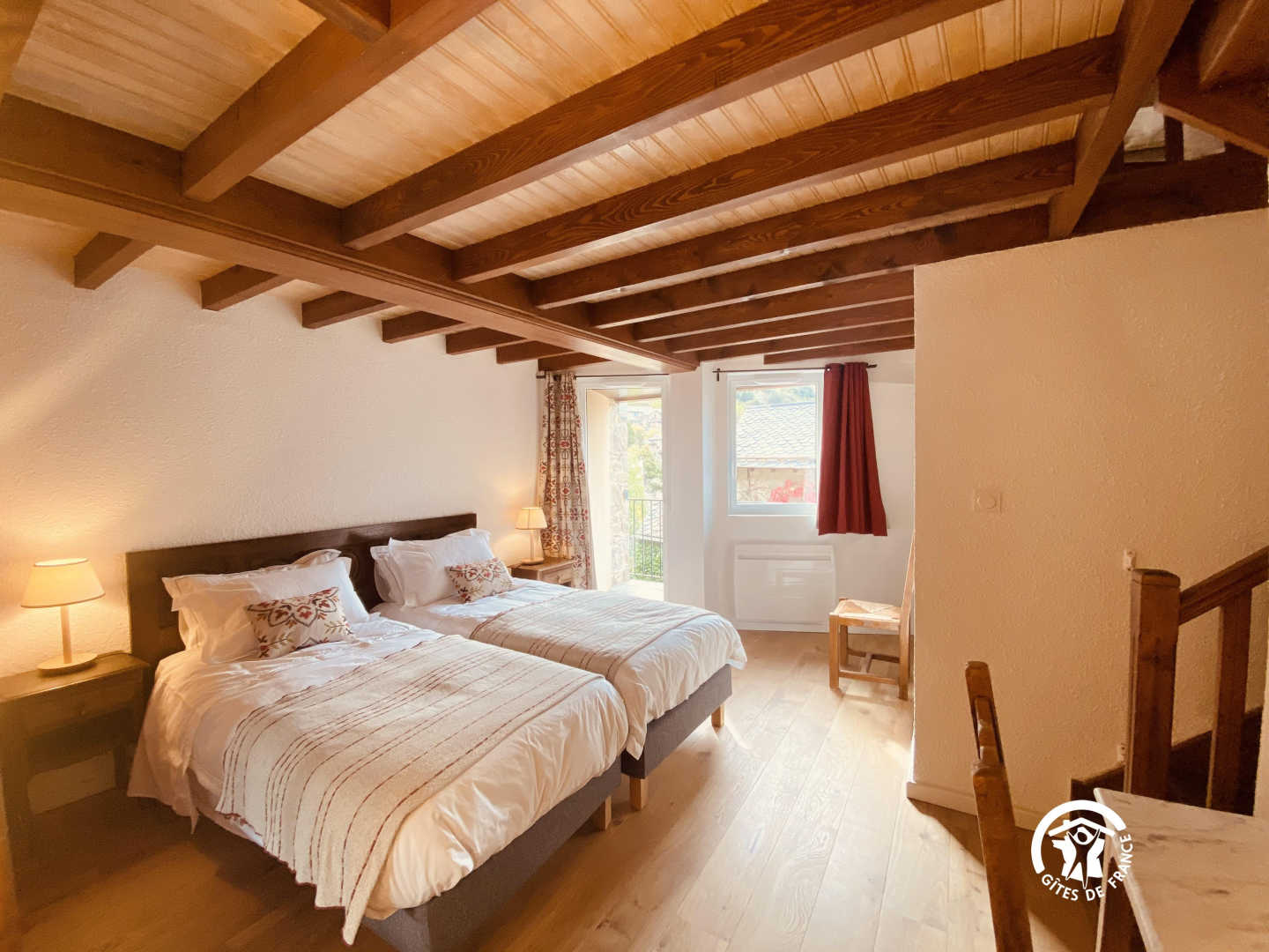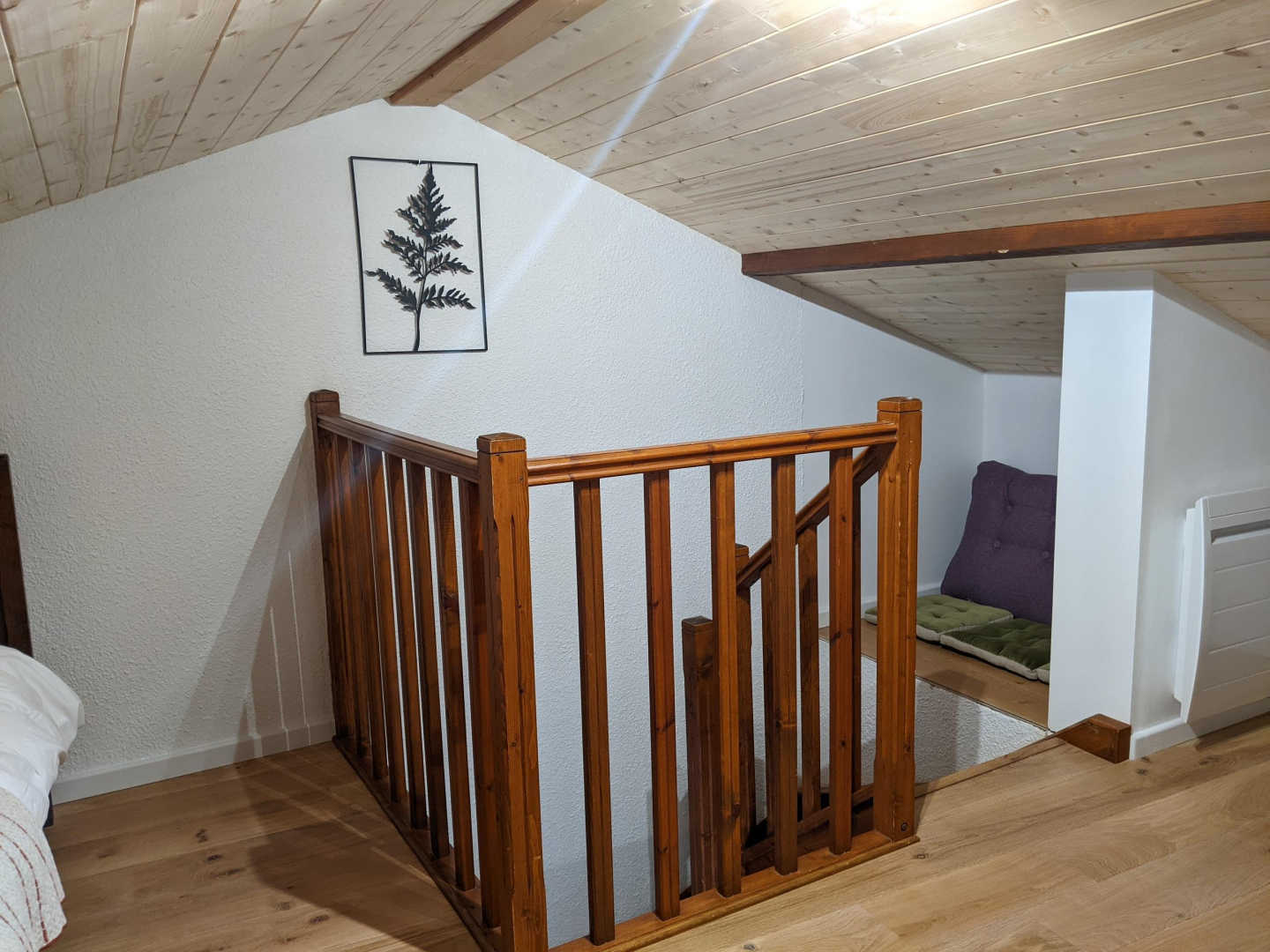 eine Mezzanine mit 2 Einzelbetten 90 und angrenzendem Badezimmer mit kleiner Badewanne und WC. 1 separates WC.