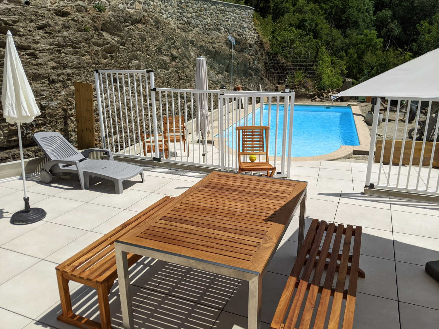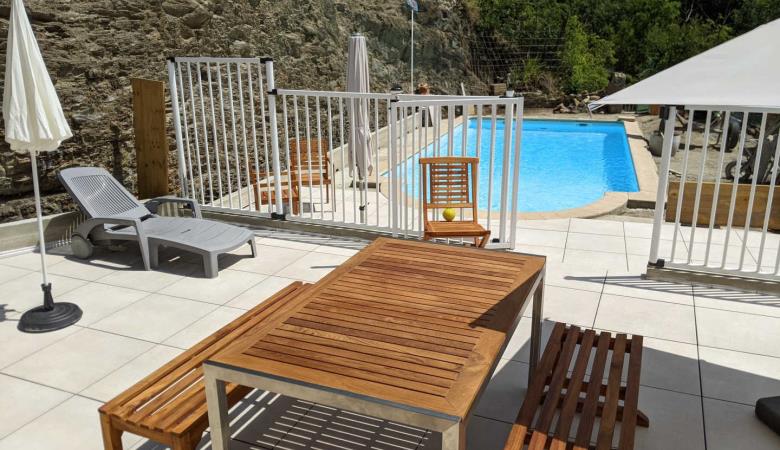 Der Pool (9,2 m x 3,5 m max, T max 1,6 m) ist gesichert und direkt von der Terrasse der Unterkunft aus zugänglich. Er wird gemeinsam mit der gegenüberliegenden Unterkunft "Montserrat Figueras" genutzt. Er ist normalerweise von Juni bis September geöffnet und das Wasser wird auf ca. 23°C erwärmt.