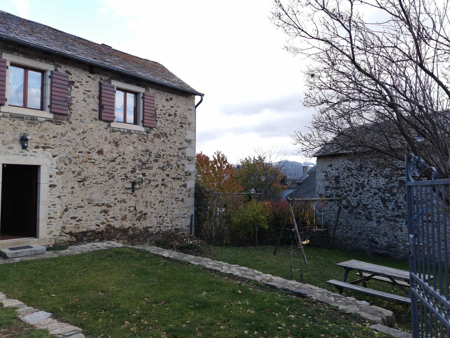 Hof und geschlossener Garten mit Grill, Gartenmöbeln, Klettergerüst.