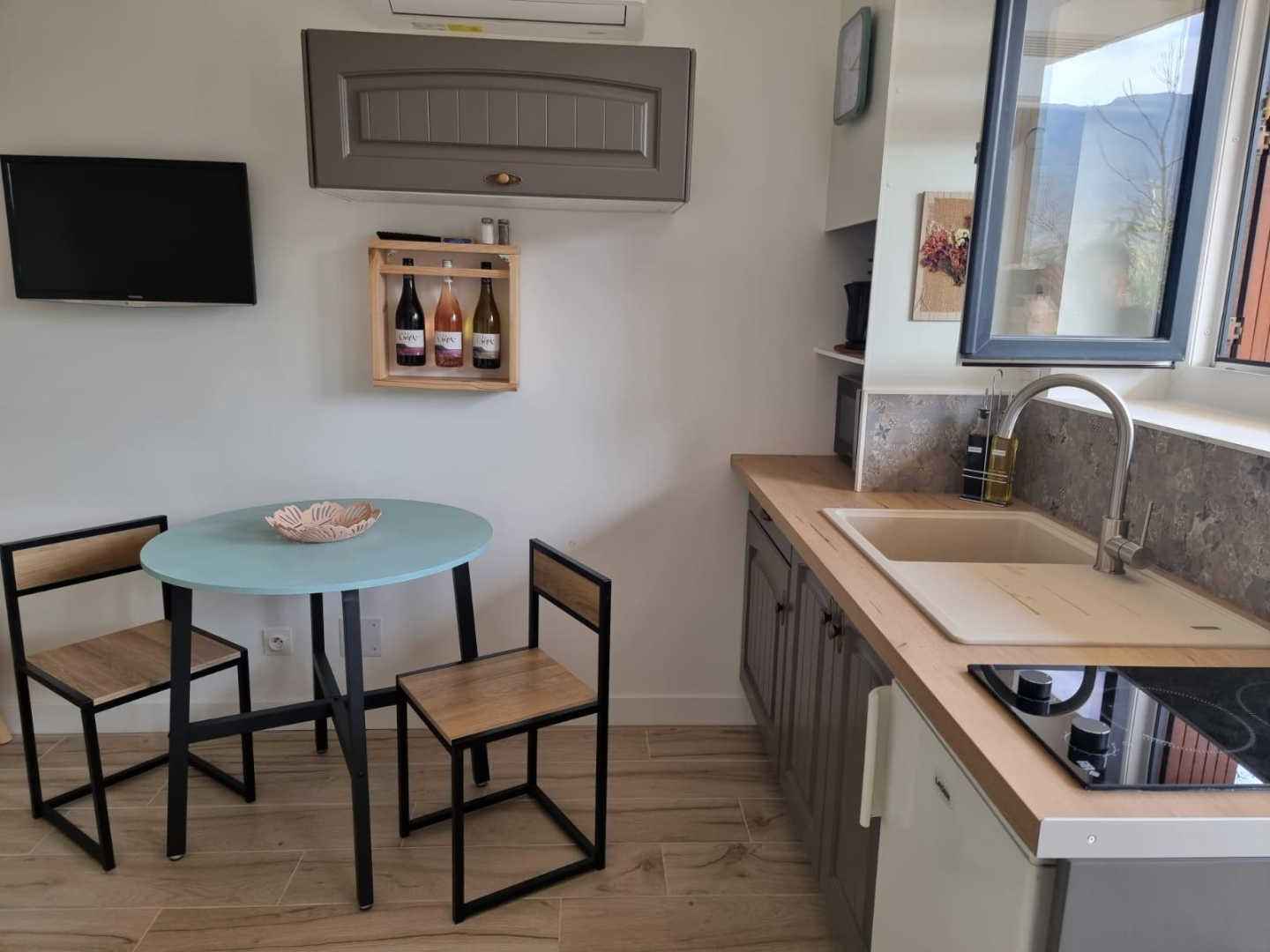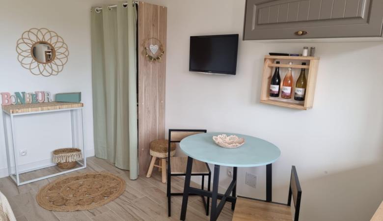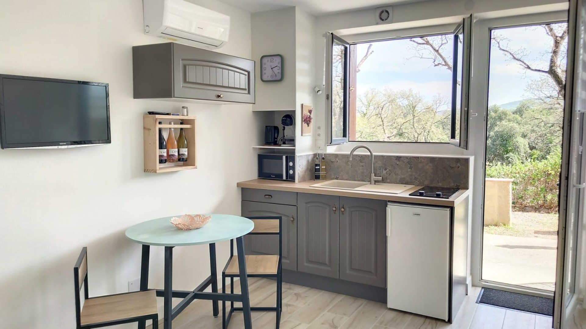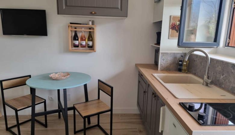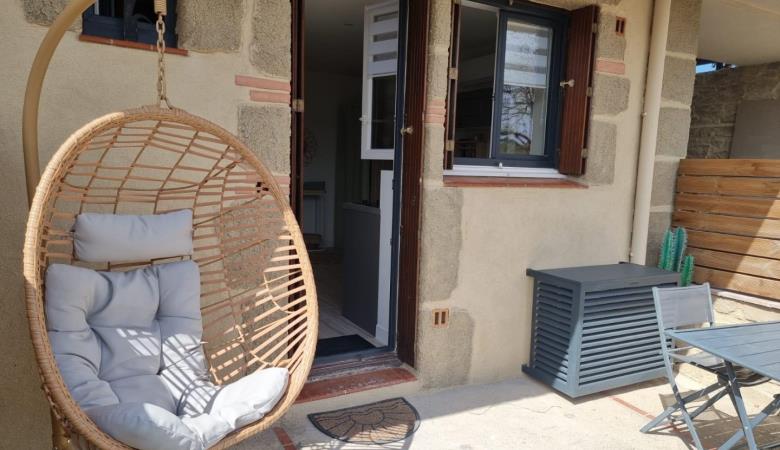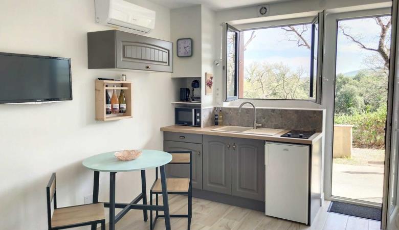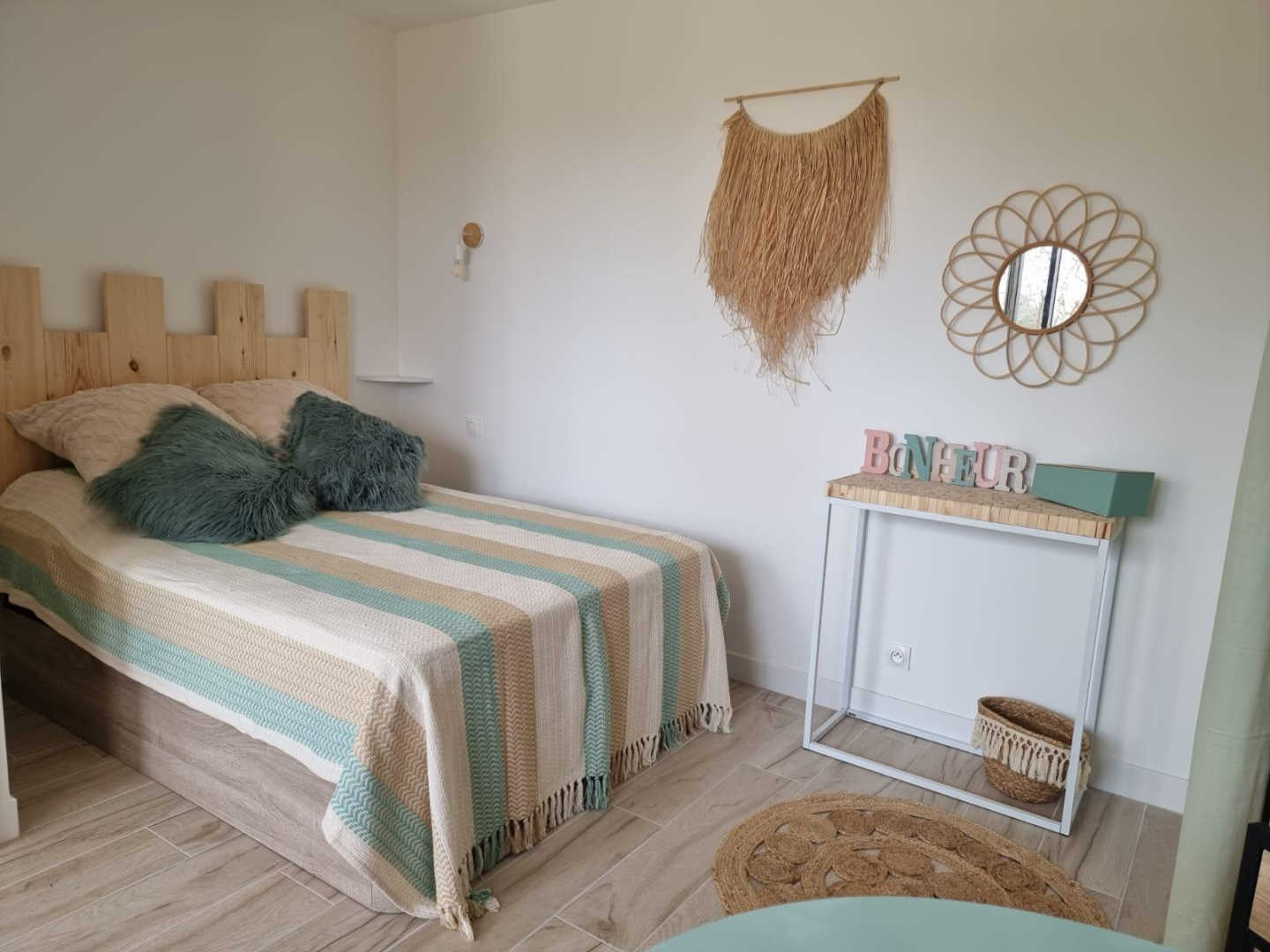 Erdgeschoss: Dieses hübsche Studio ist mit einer Küche mit Wohnraum (1 Bett 140) und einem Badezimmer (WC) ausgestattet und öffnet sich zu seiner Terrasse (18 m²) mit Blick auf das Anwesen.