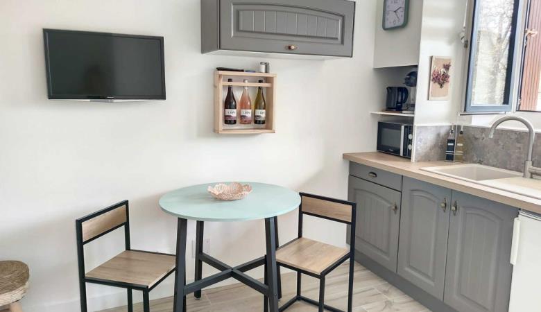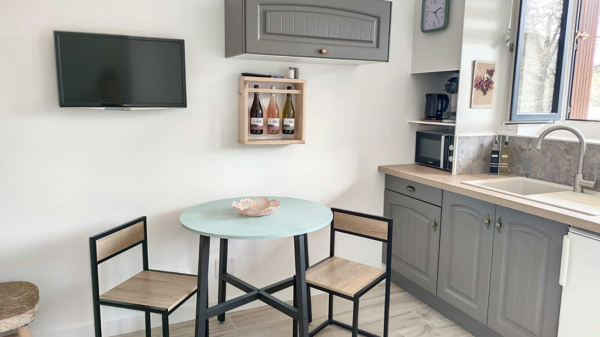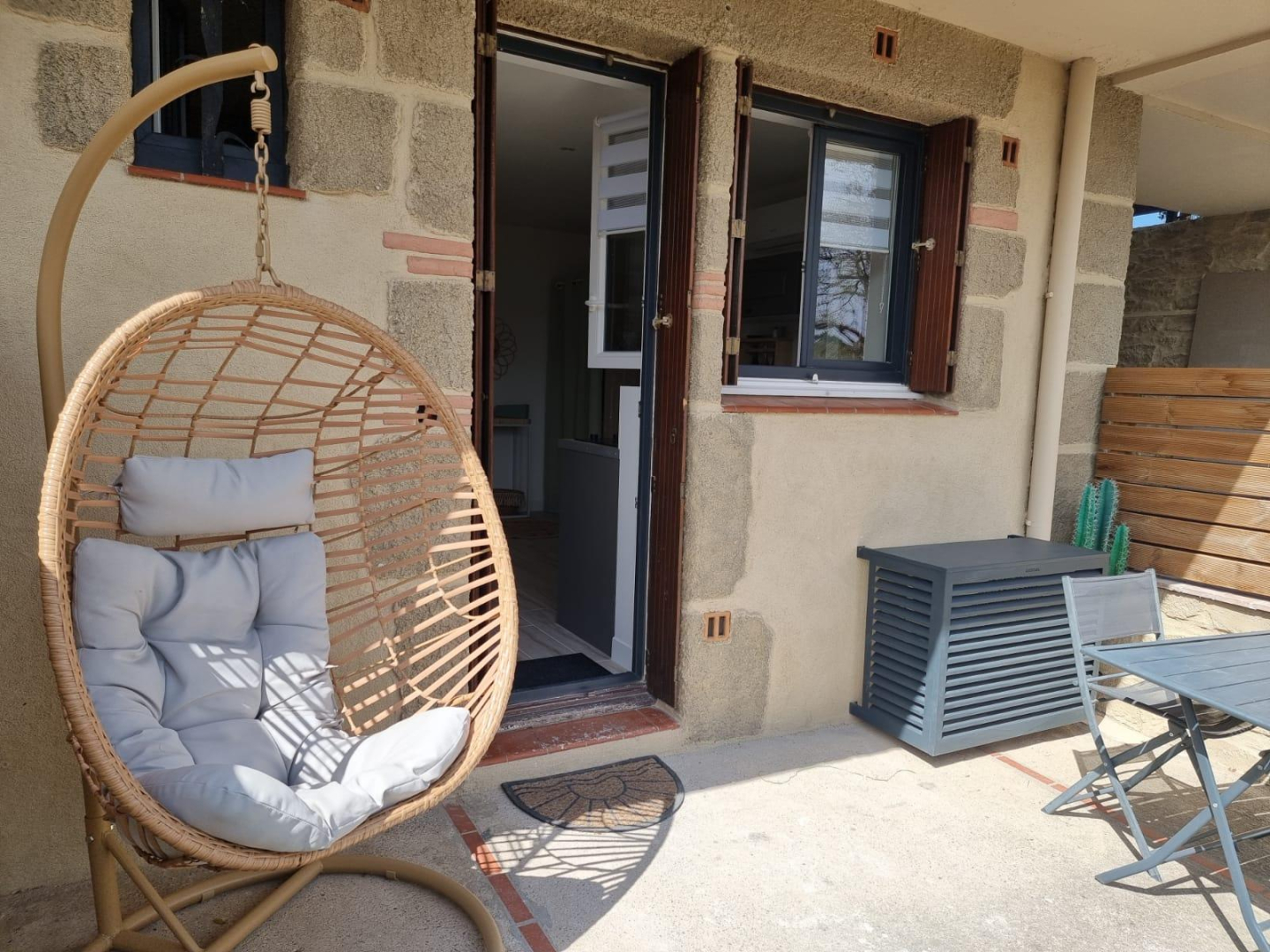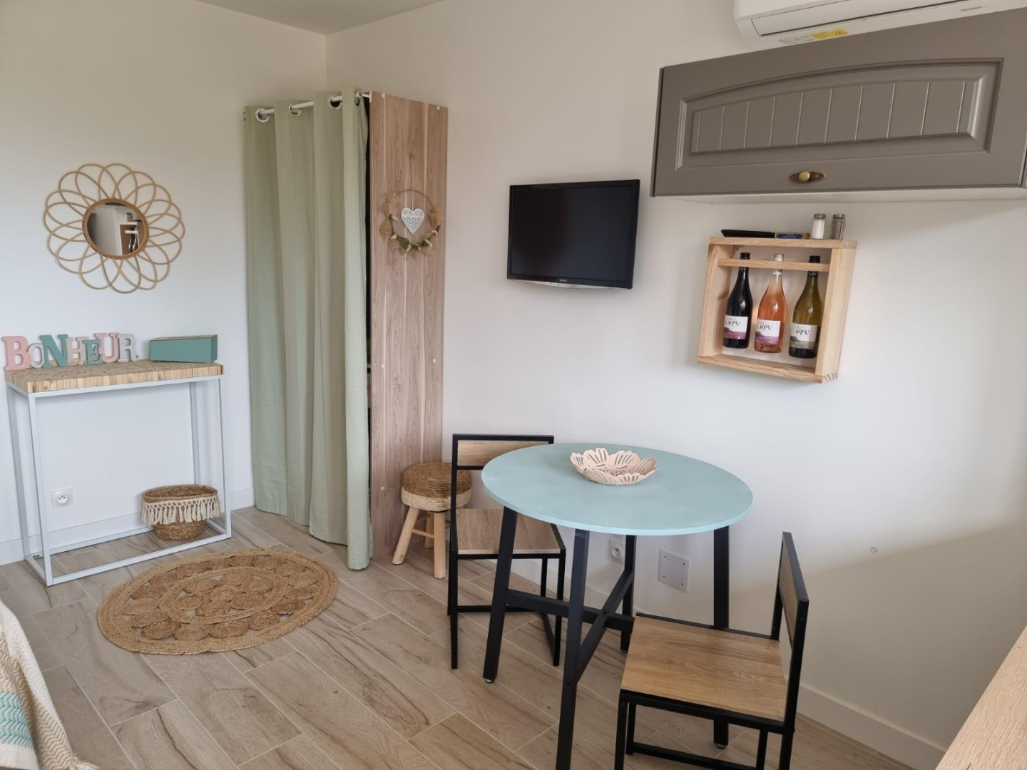 Erdgeschoss: Dieses hübsche Studio ist mit einer Küche mit Wohnraum (1 Bett 140) und einem Badezimmer (WC) ausgestattet und öffnet sich zu seiner Terrasse (18 m²) mit Blick auf das Anwesen.