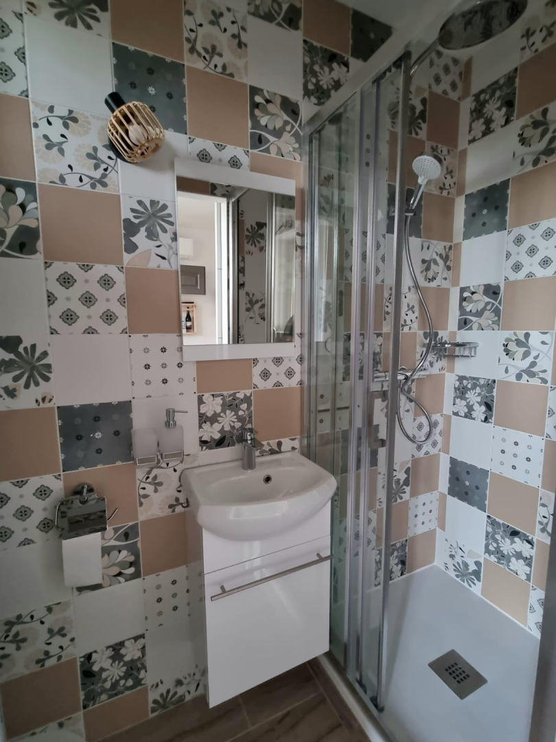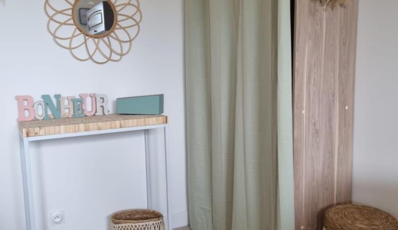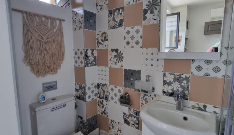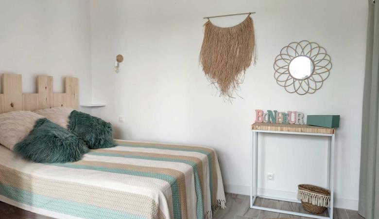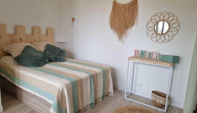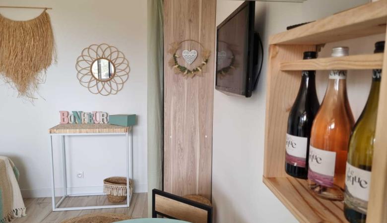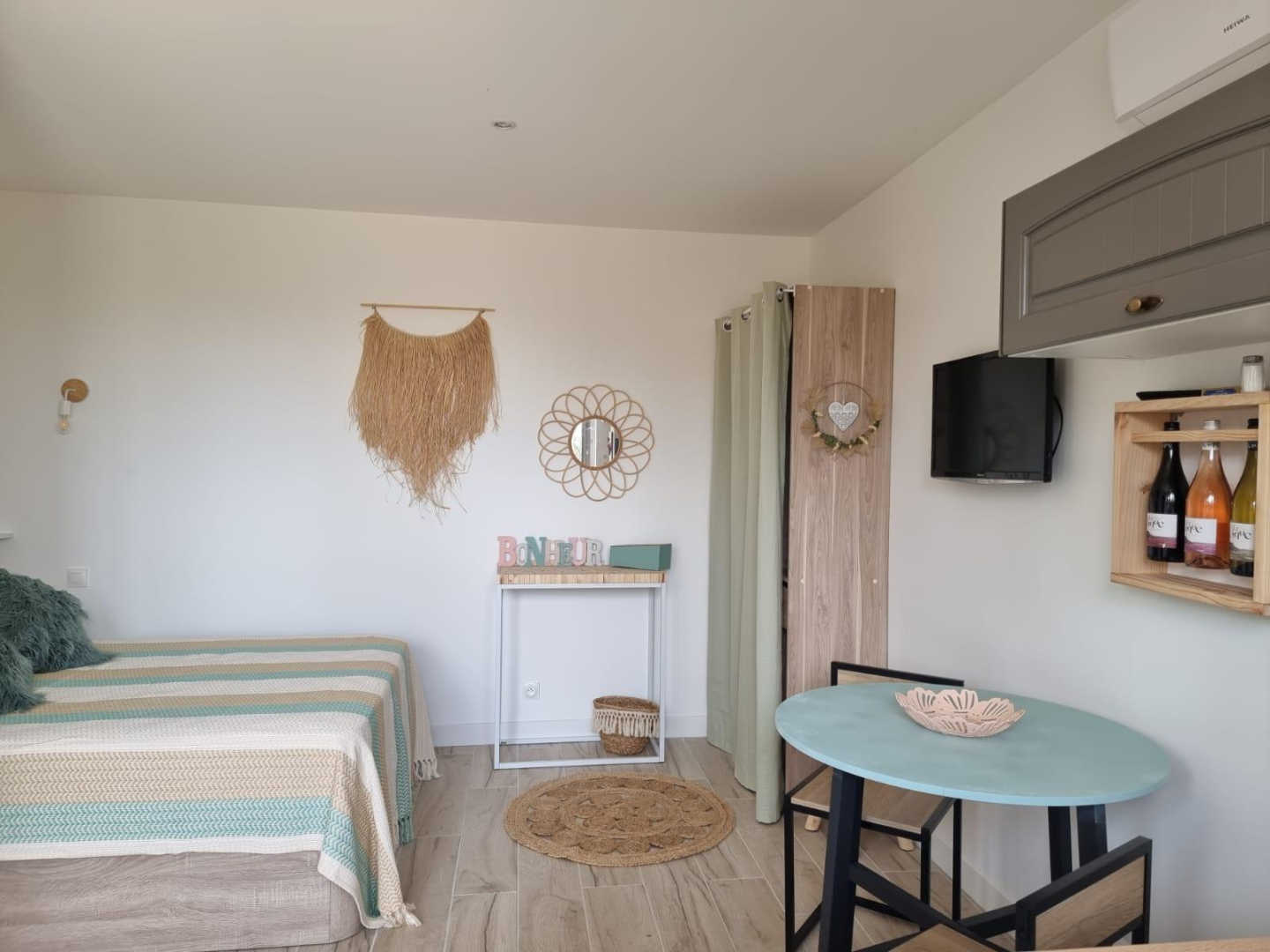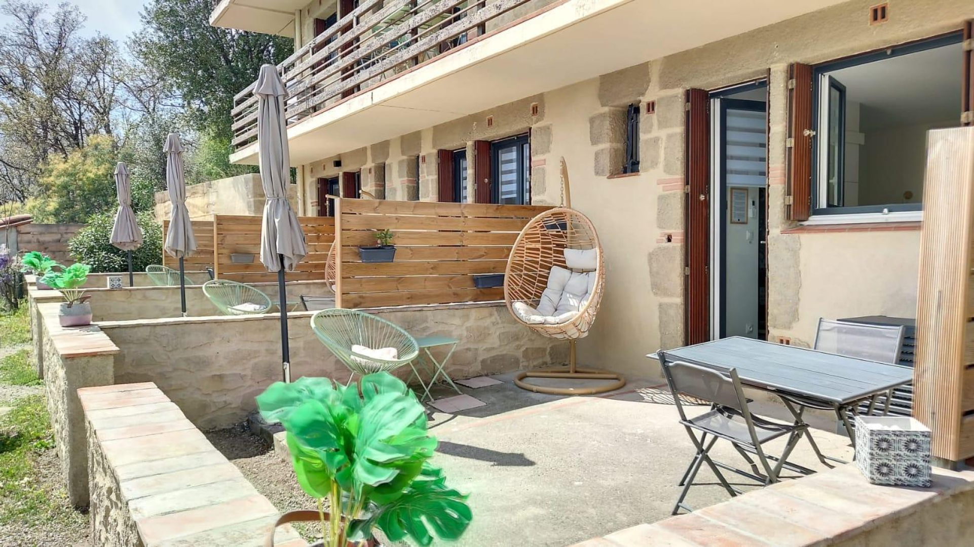 Erdgeschoss: Dieses hübsche Studio ist mit einer Küche mit Wohnraum (1 Bett 140) und einem Badezimmer (WC) ausgestattet und öffnet sich zu seiner Terrasse (18 m²) mit Blick auf das Anwesen.