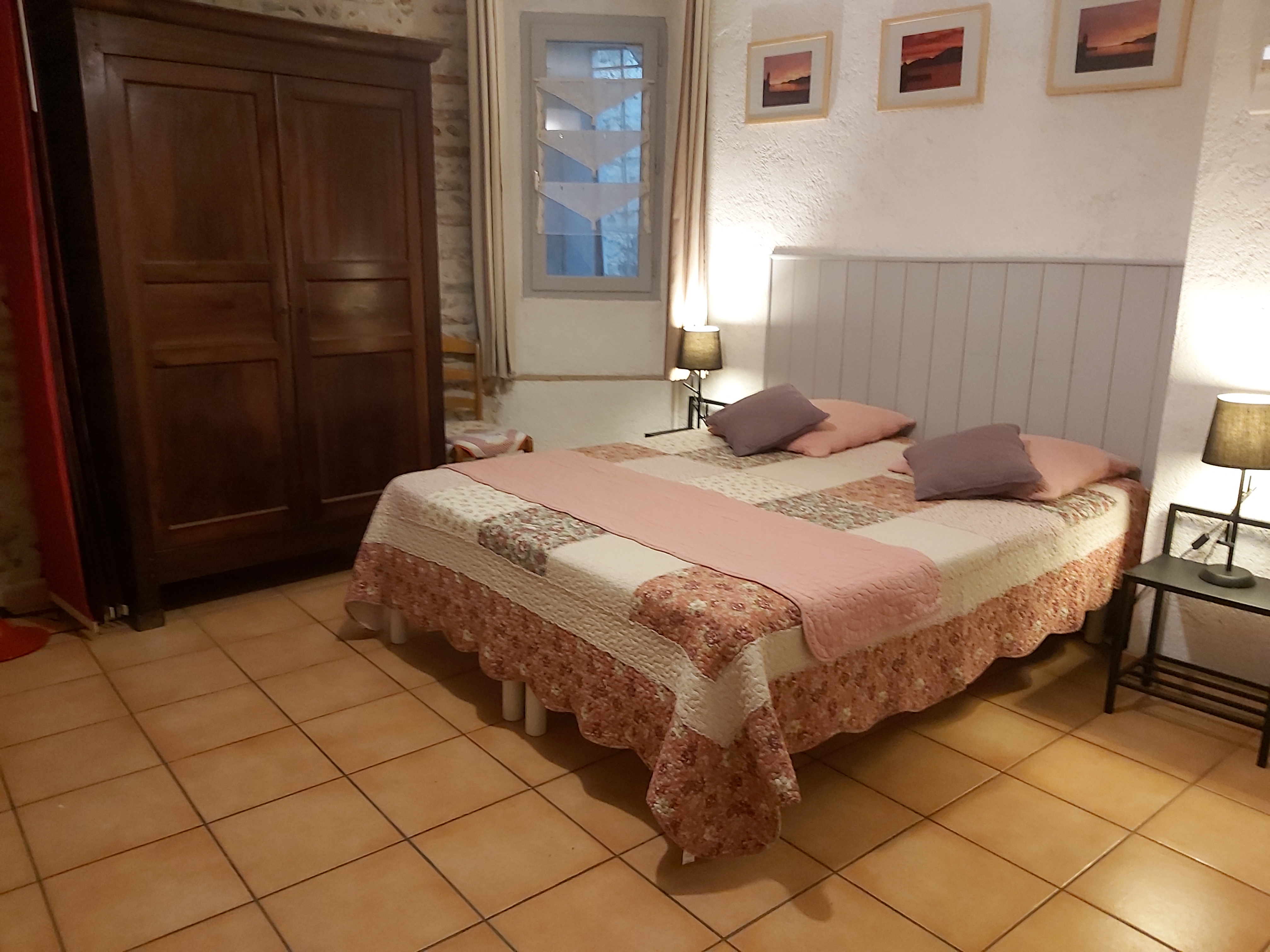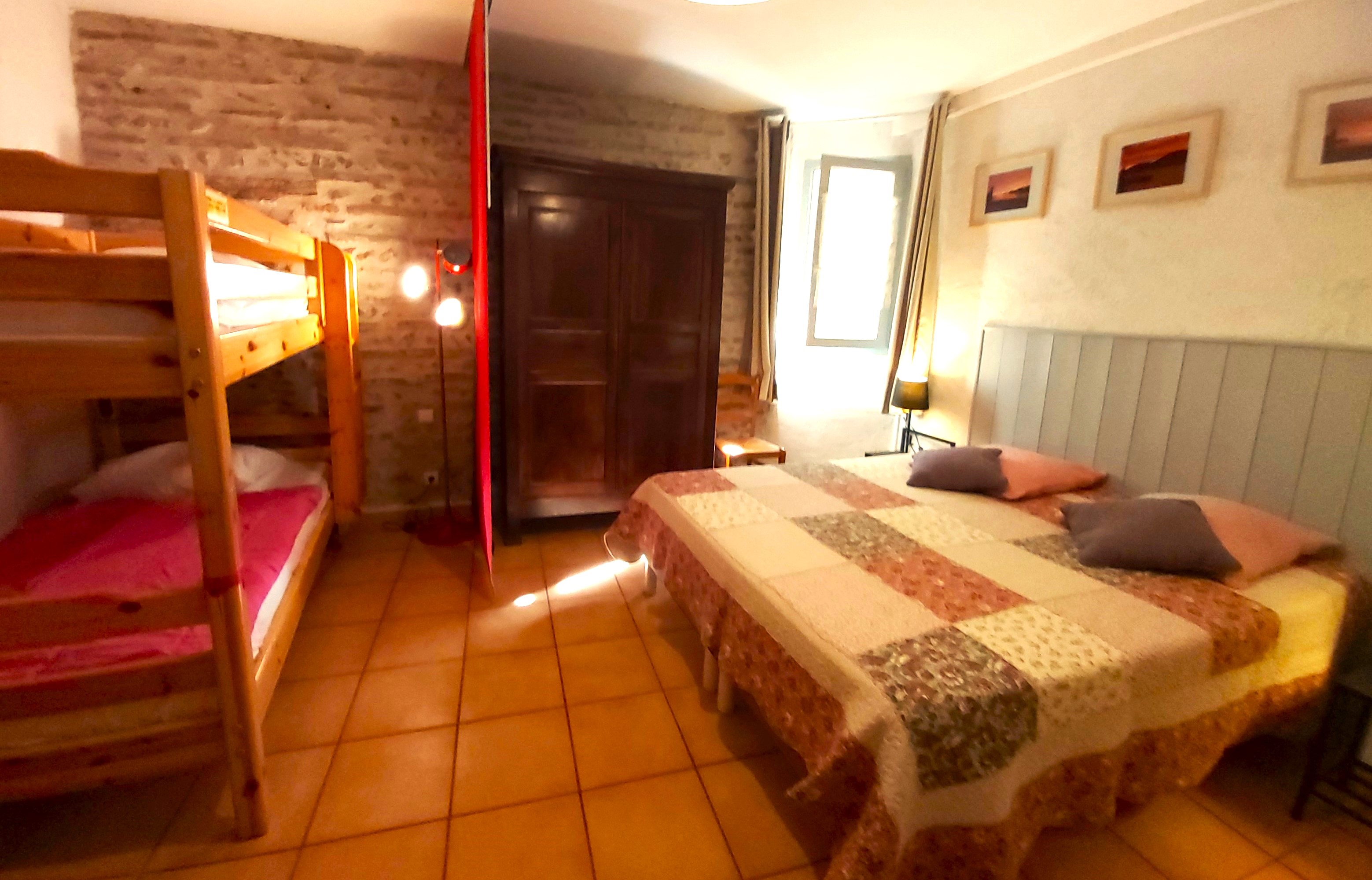 Ruhiges Zimmer an der Rückseite des Hauses mit Fenster zum Hof, 1 Bett 160 x 200 und 1 Etagenbett, durch eine japanische Trennwand getrennt, Badezimmer mit Dusche, Waschtisch mit Ablage, Föhn.