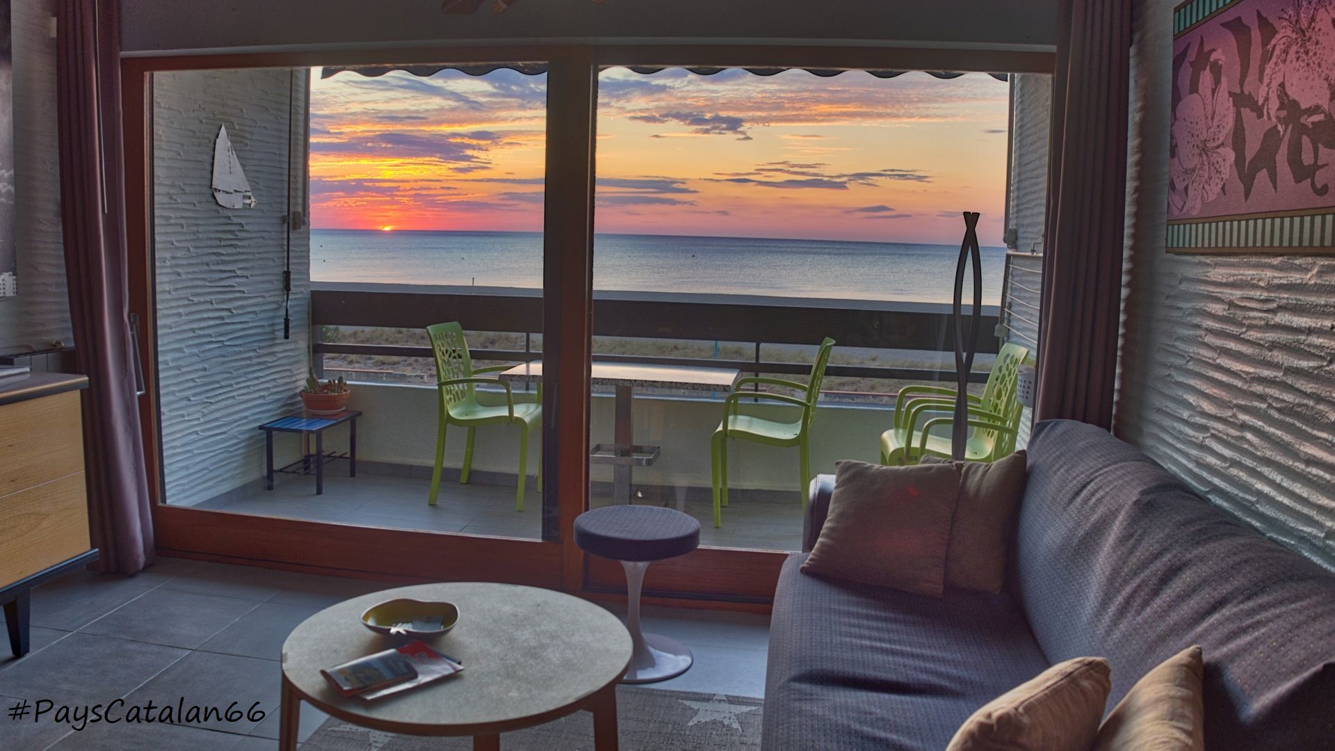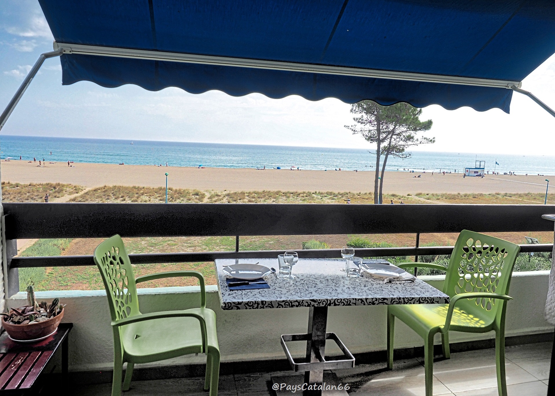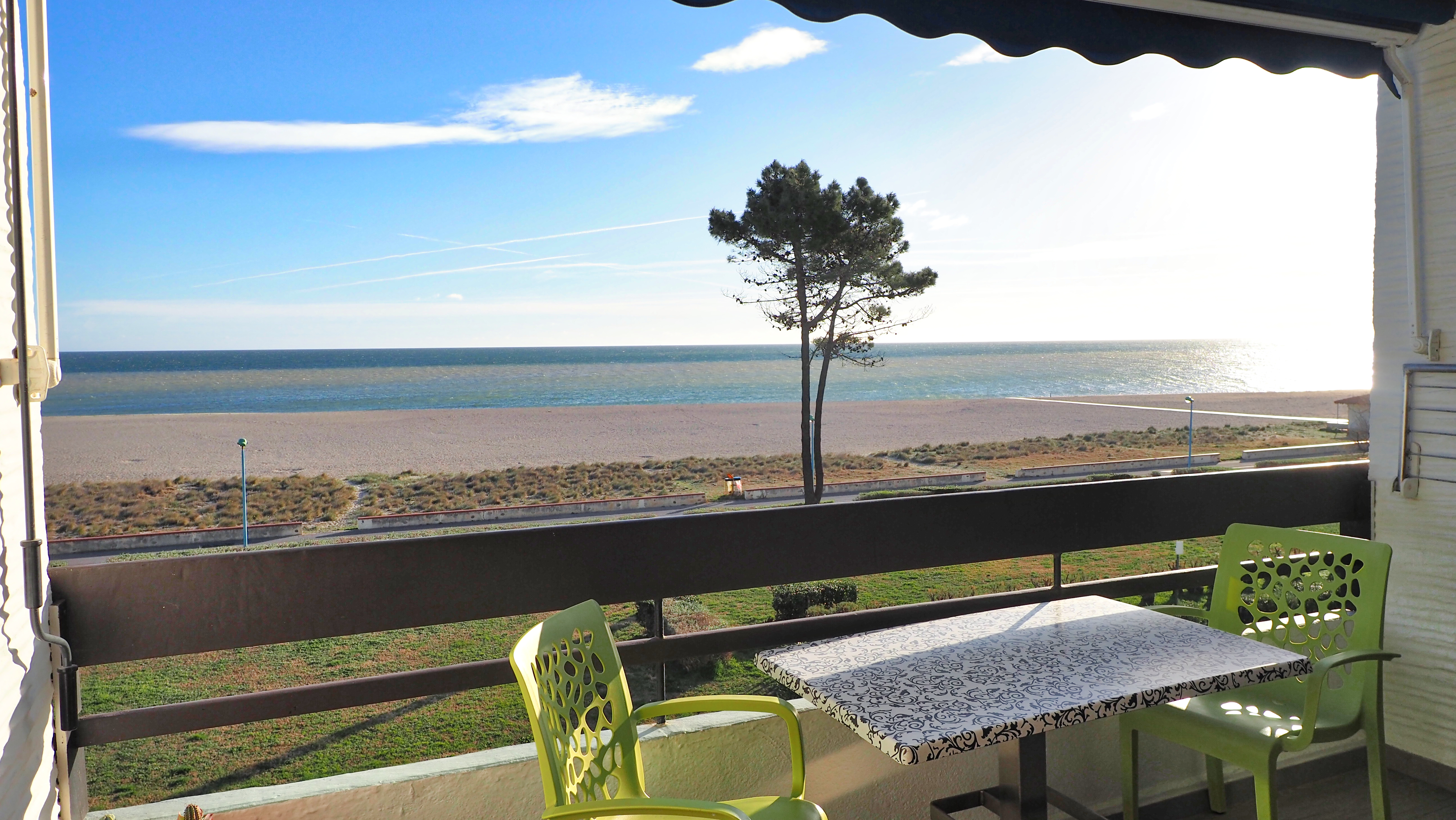 * 6 m² große, offene Loggia mit 180 Grad Blick auf den Strand, von Canet-en-Roussillon bis zu den Albères.